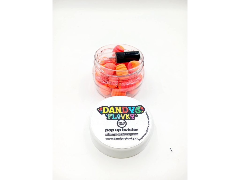 Plovoucí POP-UP twister Dandys Plovky 18x15mm 40g vyrobené z kvalitní esence a směsí. Jsou vhodné do každého počasí a ročního období. Na výběr je z velkého množství barev (fluo barvy) a příchutí, aroma vydrží několik měsíců a ve vodě vydrží boilies i několik dní. Skvělé pro sportovní rybolov.