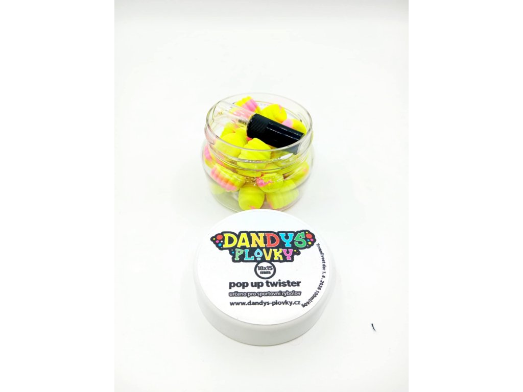 Plovoucí POP-UP twister Dandys Plovky 18x15mm 40g vyrobené z kvalitní esence a směsí. Jsou vhodné do každého počasí a ročního období. Na výběr je z velkého množství barev (fluo barvy) a příchutí, aroma vydrží několik měsíců a ve vodě vydrží boilies i několik dní. Skvělé pro sportovní rybolov.