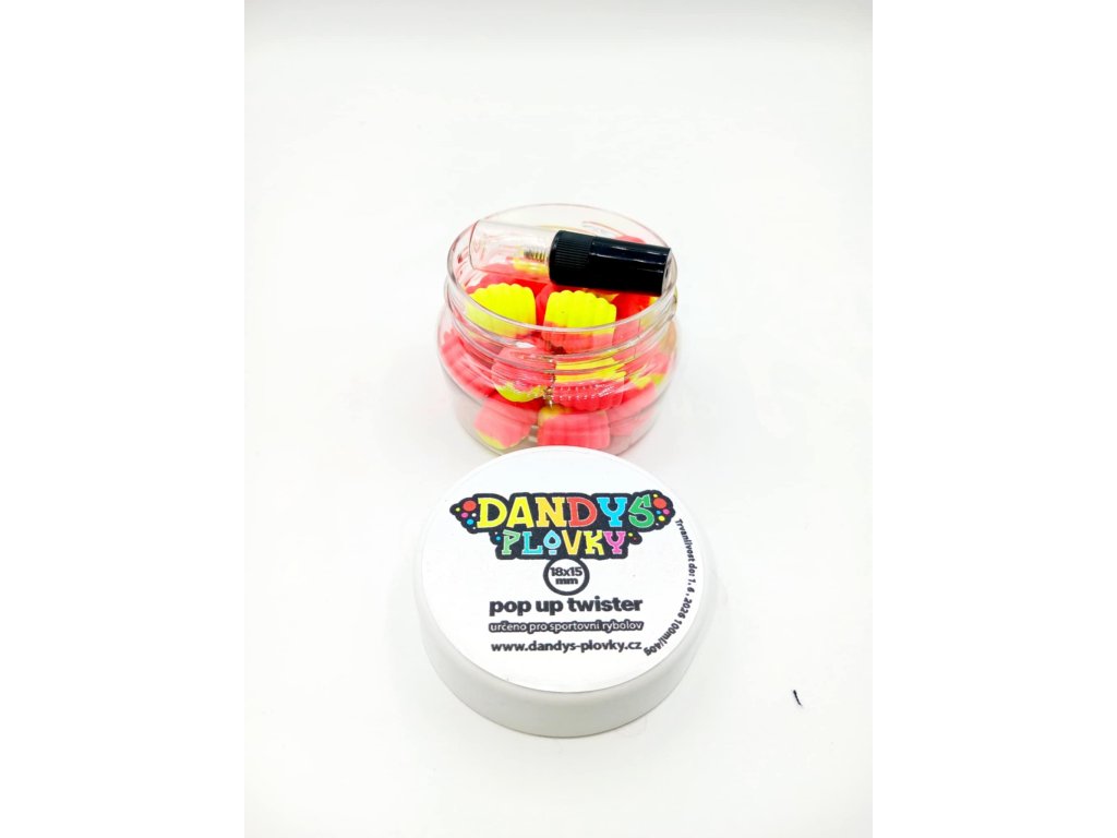 Plovoucí POP-UP twister Dandys Plovky 18x15mm 40g vyrobené z kvalitní esence a směsí. Jsou vhodné do každého počasí a ročního období. Na výběr je z velkého množství barev (fluo barvy) a příchutí, aroma vydrží několik měsíců a ve vodě vydrží boilies i několik dní. Skvělé pro sportovní rybolov.